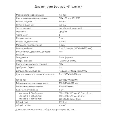 Диван-трансформер Италмас (Аквилон) продается в интернет-магазине mebel-online-izhevsk.ru по цене 73 376 руб. Есть доставка по Ижевску и Удмуртской Республике. Возможность подъема на этаж и сборки уточняйте у менеджера по телефону 8(800)505-27-11.